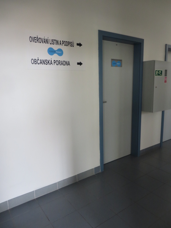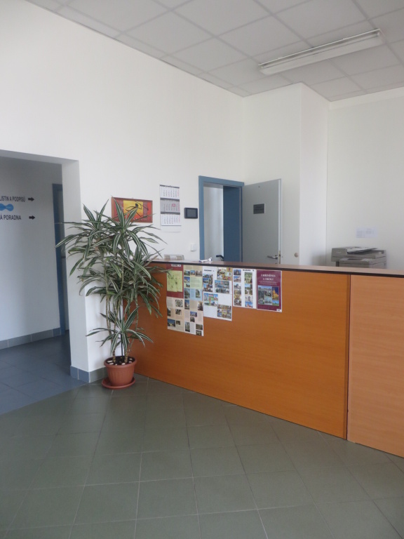 Interiér informačního centra tvoří otevřená místnost s informačním pultem (výška 112 cm) a dvěma kancelářemi (občanská poradna a ověřování listin) s jednokřídlými dveřmi (šířka 80 cm). Manipulační prostor v interiéru je dostatečný.