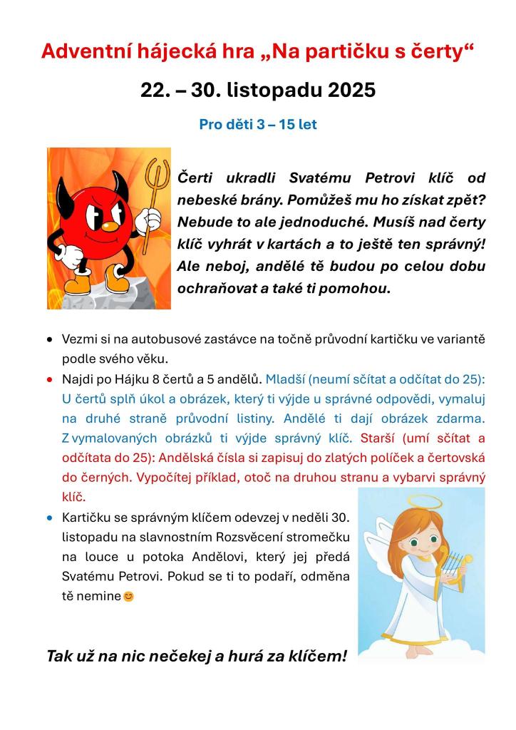 Děti musí získat od čertů klíč od nebeské brány a dát andělovi, který klíč předá sv. Petrovi. A jak ho získají?..obehrajou čerty v kartách v adventní hře NA PARTIČKU S ČERTY! Mikuláš pak ocení jejich statečnost a odmění je balíčkem.