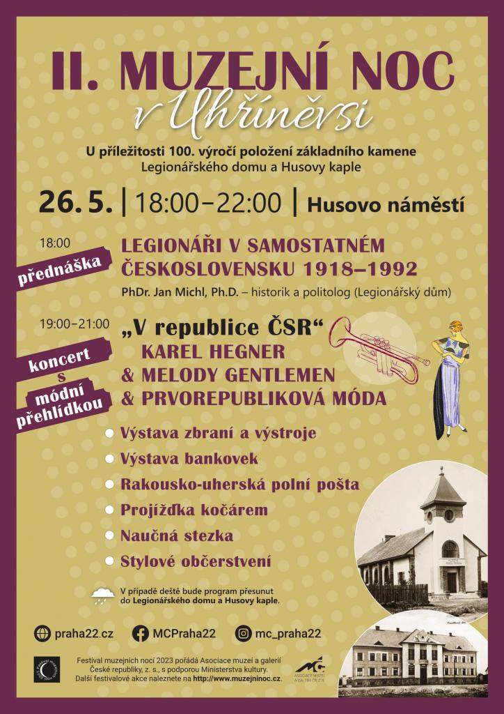 Uhříněveské muzeum se opět zapojilo do Festivalu muzejních nocí. Tentokrát se zaměříme na 100. výročí položení základního kamene Legionářského domu a Husovy kaple. Těšit se můžete nejen na koncert a módní přehlídku ve stylu První republiky. Otevřou se Vám dveře Legionářského domu i Husovy kaple, kde si budete moci prohlédnout některé dochované předměty, které se vztahují k historii legionářů z Uhříněvsi.