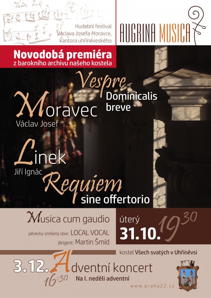 V rámci letošního již třetího ročníku našeho uhříněveského hudebního festivalu se můžete těšit na dva koncerty v kostele Všech svatých. V rámci prvního se opět podíváme do zaprášených polic kostelního archivu, který čítá původní skladby od 2. poloviny 18. století. Uslyšíte Nedělní nešpory uhříněveského kantora, varhaníka a skladatele Václava Josefa Moravce. Dále pak Requiem sine Offertorio od věhlasného českého skladatele Jiřího Ignáce Linka, které se také dochovalo v Uhříněvsi. To vše dva dny před Památkou všech věrných zemřelých (tedy Dušiček) a v předvečer svátku Všech svatých, tedy uhříněveské pouti. Ono datum je úterý 31. října od 19.30.