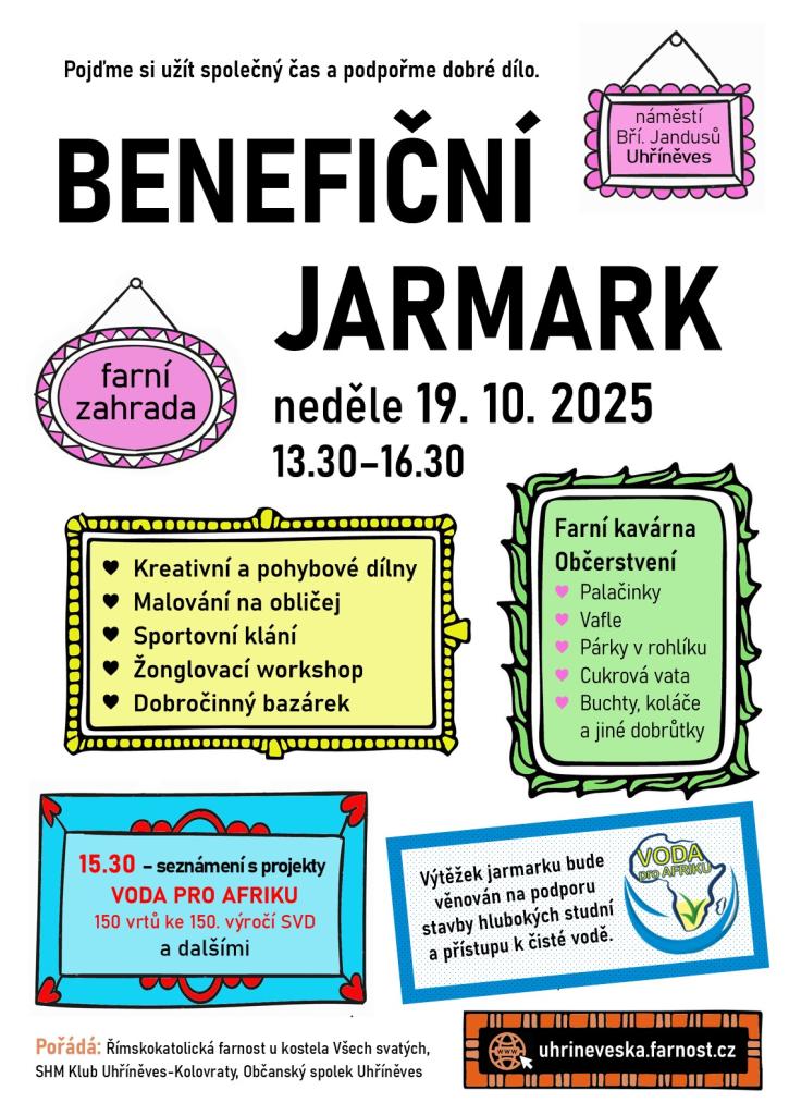Výtěžek jarmarku bude věnován na podporu projektu VODA PRO AFRIKU - stavbu 150 hlubokých studní a přístupu k čisté vodě v Africe. Projekt je dílem verbistů (Societas Verbi Divini), misionářů, v jehož řadách jsou kněží uhříněveské farnosti. V současnosti je realizováno 57 studní a čtyři jsou ve výstavbě.