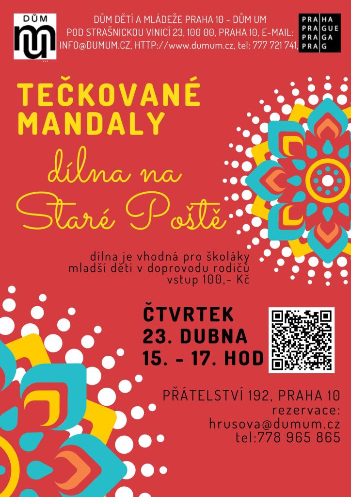 Dům dětí a mládeže Praha 10 zve na dílnu tečkované mandaly, která se koná ve čtvrtek 23. dubna 2026 od 15:00 do 17:00 hodin. Dílna je určena pro školáky a mladé lidi, kteří se mohou zúčastnit pod dohledem dospělé osoby.
