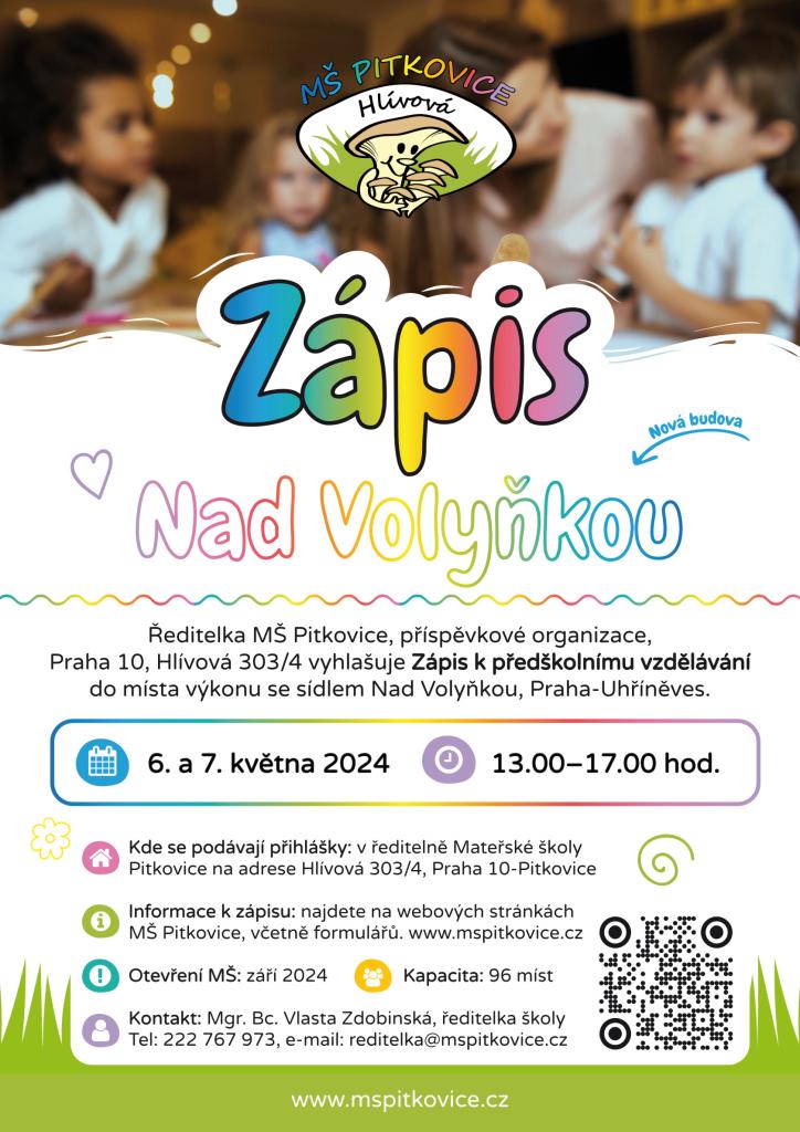 Ředitelka MŠ Pitkovice, příspěvkové organizace, Praha 10, Hlívová 303/4 vyhlašuje ZÁPIS k předškolnímu vzdělávání do místa výkonu se sídlem Nad Volyňkou, Praha – Uhříněves.